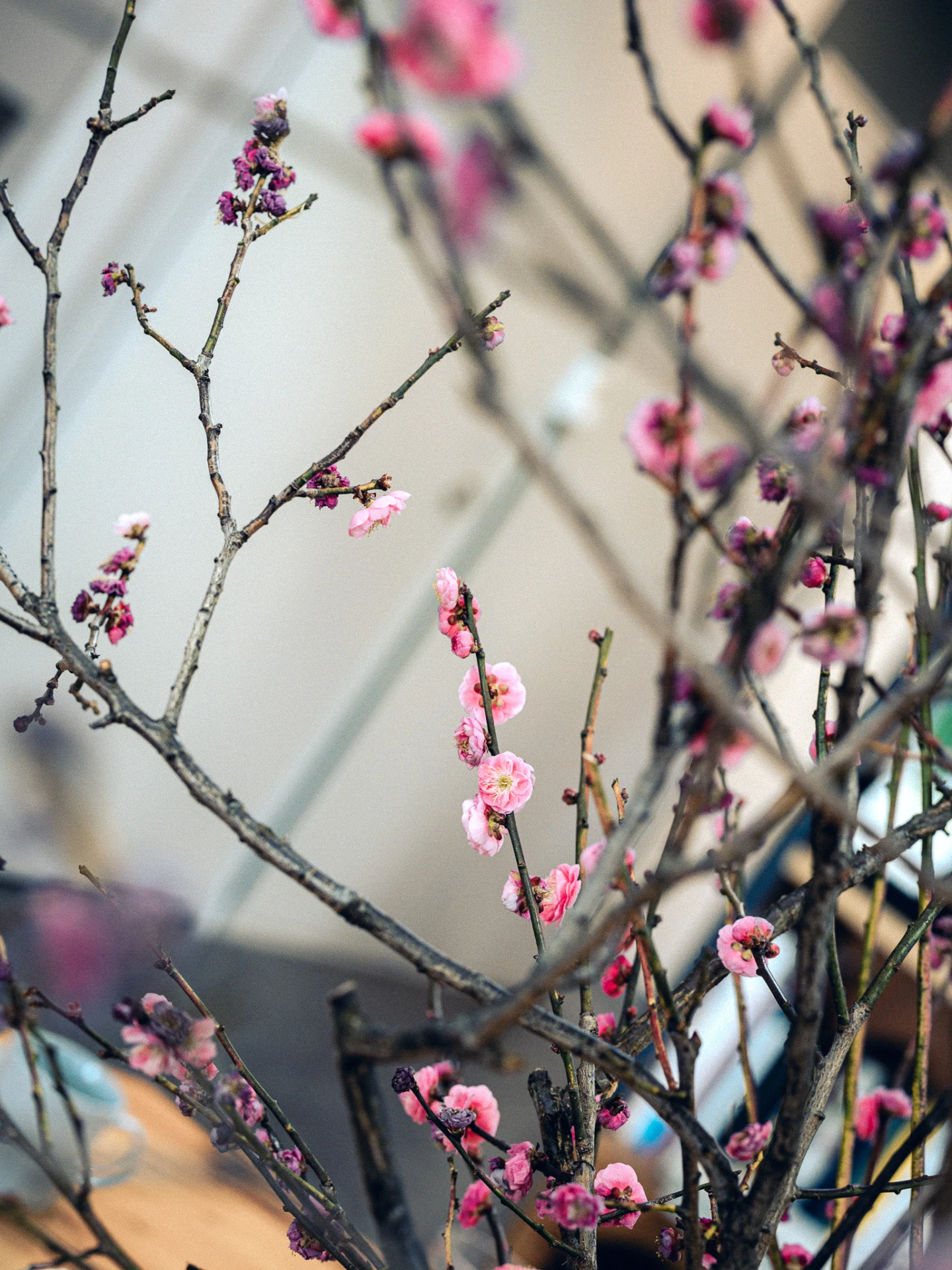 Flower&Green 26年1月号 大寒を迎え、寒さの厳しい日が続いています。 今月は、鮮やかなピンクの花を咲かせたウメを飾りました。 外の冬景色とは対照的に、社内には一足早く春の気配が届いています。 Photo by 神谷諒 Text By 古賀 茜 Akane Koga 制作デスク 好きなこと Flower&Green 2026/01/22