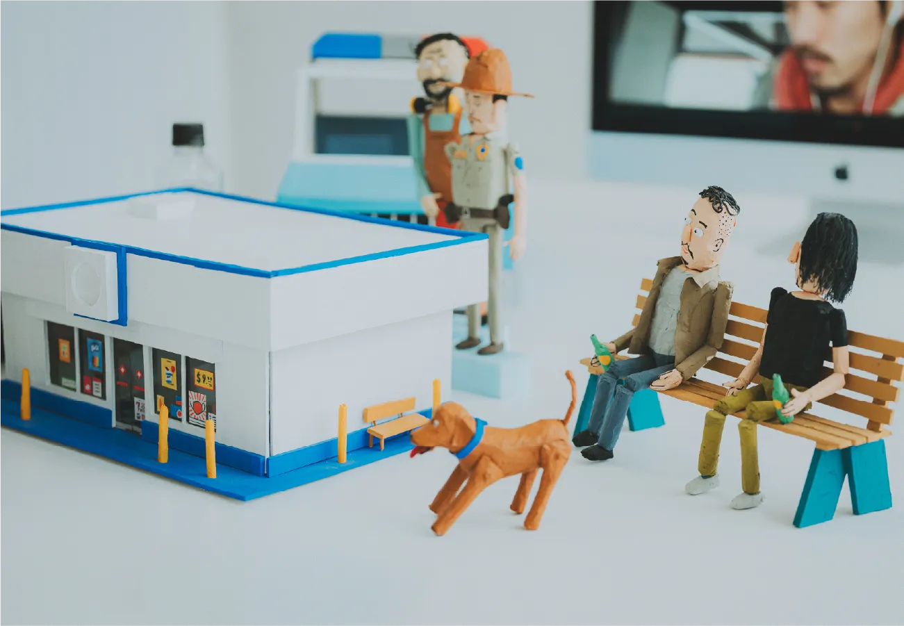 制作の大まかな流れを言うと、まず土屋さんが描いたラフコンテがあって、それをもとに北田さんが主要人物ふたりのキャラクターの人形やガソリンスタンドの立体模型をつくってくれたんですよね。